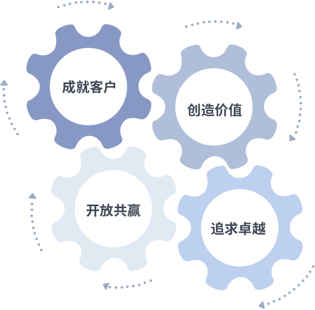 成就客户是一切决策的出发点,创造价值是衡量所有工作的标准,追求卓越是安信16平台做事做人的态度,开放共赢是安信16平台的格局也是最终的结果。价值观的齿轮环环相扣,推动着组织里的每个人不断向前。